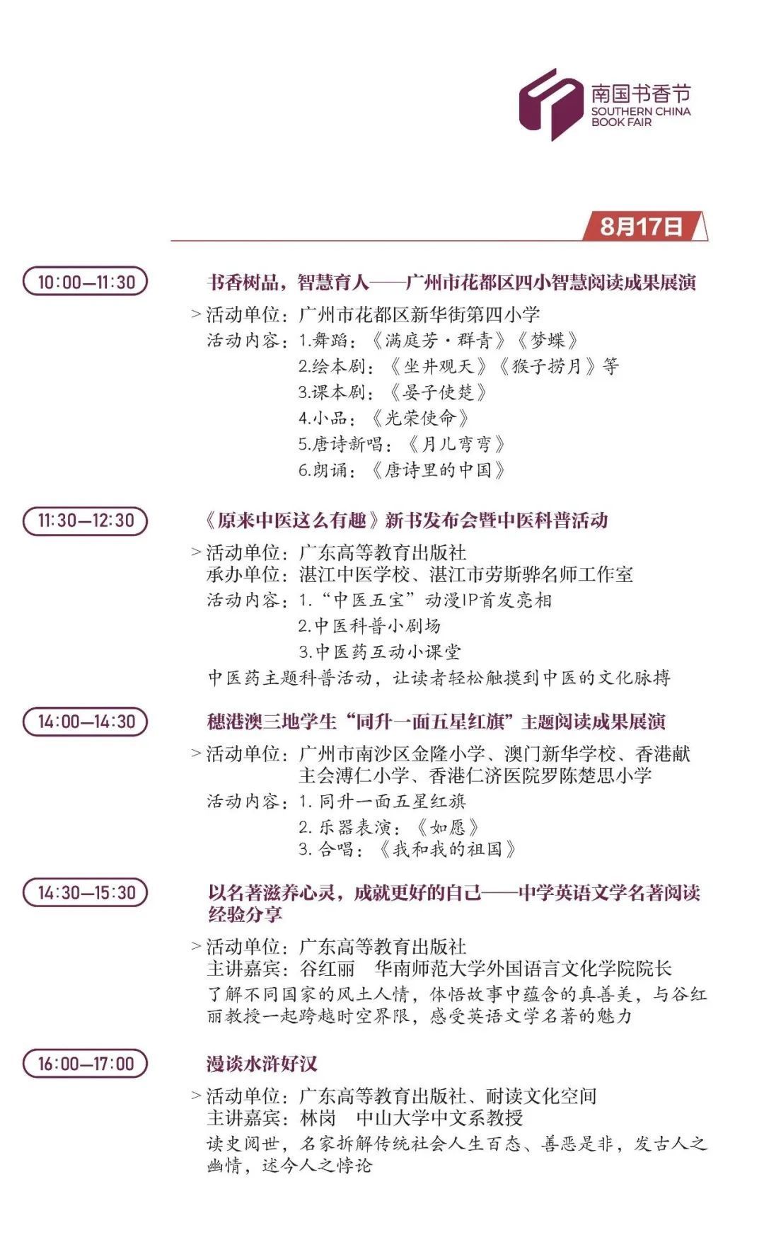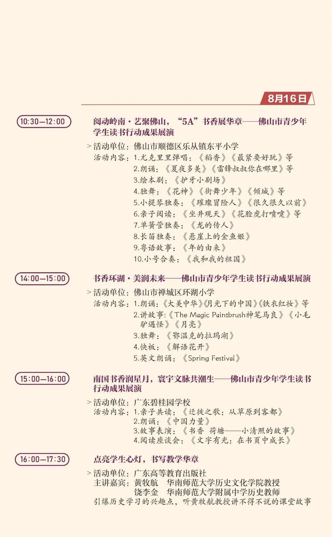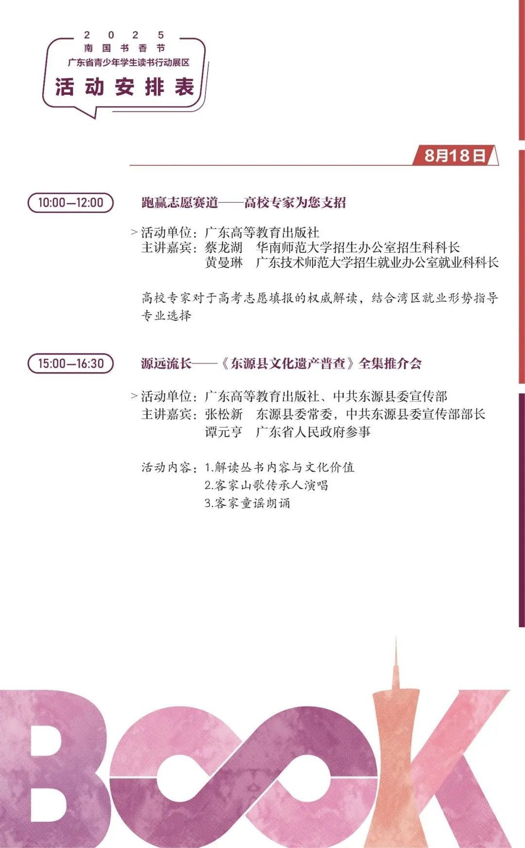 ★活动推广区:作为活力引擎,该区域将举办多场精彩纷呈的活动。开幕式将于所在展厅3号舞台举行2025全国青少年学生读书行动区域优秀案例授牌仪式暨广东省读书行动成果展演。展期内,广州市、佛山市、深圳市南山区教育局及广东高等教育出版社等单位将接力带来主题讲座、阅读分享、故事表演、诗词朗诵、亲子共读等13场精彩活动。